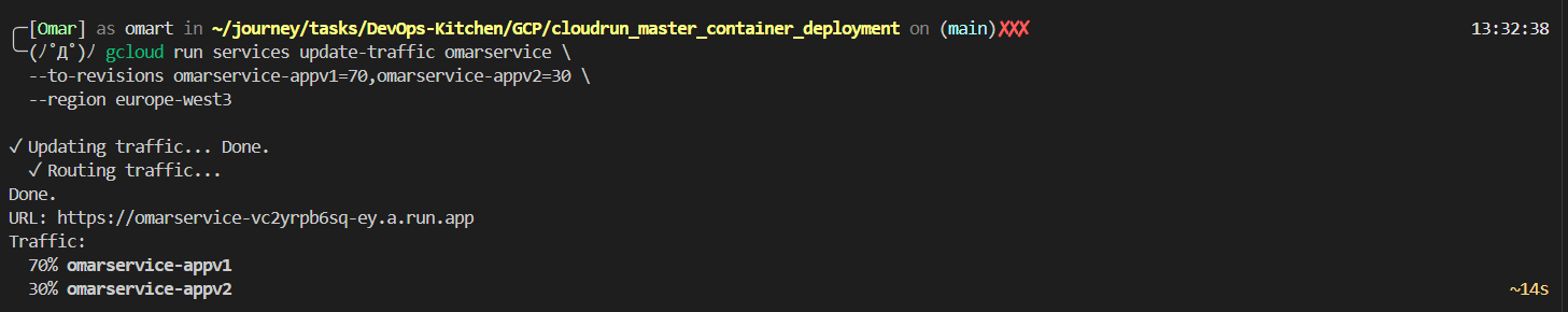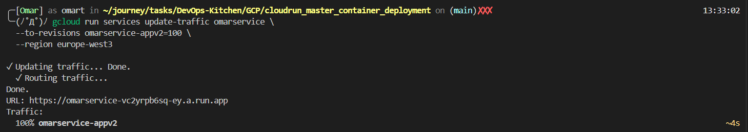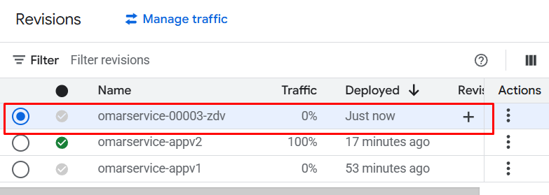 `--no-traffic` is the magic flag. v2 is deployed and running — but zero users are sent to it yet. You can test it via its revision URL while v1 keeps serving everyone else without interruption.