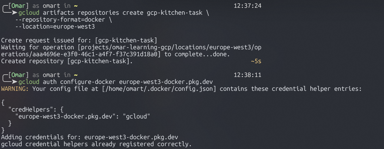 This command writes credentials into Docker's config so it knows how to log into GCP's registry automatically. Without this, Docker would get a "permission denied" when trying to push.