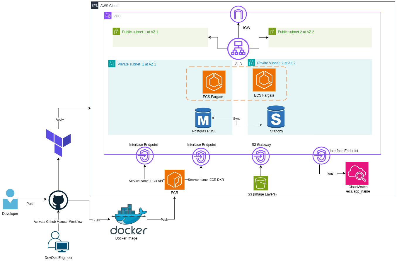 | **Infrastructure** | Terraform apply ECS, RDS, ALB  |